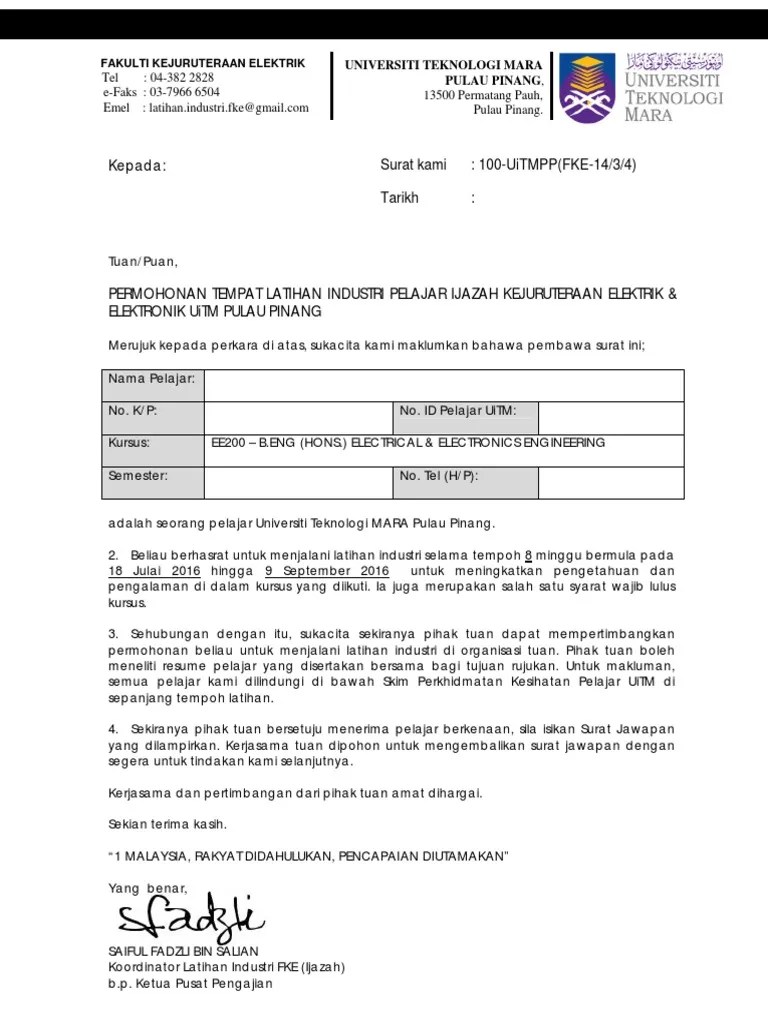 Fakulti kejuruteraan elektrik universiti teknologi mara · no. Tuan/puan memohon tempat untuk menjalani latihan industri perkara di atas adalah dirujuk. Bagi memudahkan urusan penempatan pelajar, diharapkan pihak tuan dapat . Surat pertukaran calon penempatan 5.